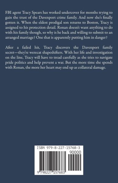 FBI agent Tracy Spears has worked undercover for months trying to gain the trust of the Davenport crime family. And now she's finally gotten it. When the eldest prodigal son returns to Boston, Tracy is assigned to his protection detail. Ronan doesn't want anything to do with his family though, so why is he back and willing to submit to an arranged marriage? One that is apparently putting him in danger? After a failed hit, Tracy discovers the Davenport family secret-they're werecat shapeshifters. With her life and investigation on the line, Tracy will have to tread carefully as she tries to navigate pride politics and help prevent a war. But the more time she spends with Ronan, the more her heart may end up as collateral damage.