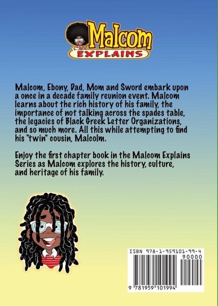 Malcom, Ebony, Dad, Mom and Sword embark upon a once in a decade Family Reunion Event. Malcom learns about the rich history of his family, the importance of not talking across the spades table, the legacies of Black Greek Letter Organizations, and so much more. All while attempting to find his "twin" cousin, Malcolm. Join Malcom as he progresses through the multiple chapters of his family and enjoy the 1st Chapter Book in the Series; Malcom Explains - Family Reunion.