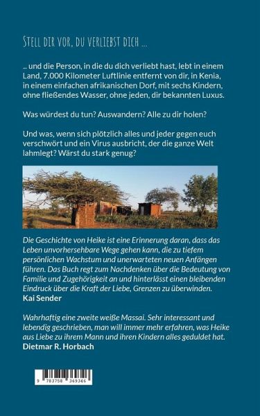 Stell dir vor, du verliebst dich ...... und die Person, in die du dich verliebt hast, lebt in einem Land, 7.000 Kilometer Luftlinie entfernt von dir, mit sechs Kindern, in einem einfachen afrikanischen Dorf, ohne fließendes Wasser, ohne jeden, dir bekannten Luxus. Was würdest du tun? Auswandern? Alle zu dir holen? Und was, wenn sich plötzlich alles und jeder gegen euch verschwört und ein Virus ausbricht, der die ganze Welt lahmlegt? Wärst du stark genug?Die Geschichte von Heike ist eine Erinnerung daran, dass das Leben unvorhersehbare Wege gehen kann, die zu tiefem persönlichen Wachstum und unerwarteten neuen Anfängen führen. Das Buch regt zum Nachdenken über die Bedeutung von Familie und Zugehörigkeit an und hinterlässt einen bleibenden Eindruck über die Kraft der Liebe, Grenzen zu überwinden. Kai SenderWahrhaftig eine zweite weiße Massai. Sehr interessant und lebendig geschrieben, man will immer mehr erfahren, was Heike aus Liebe zu ihrem Mann und ihren Kindern alles geduldet hat. Dietmar R. Horbach