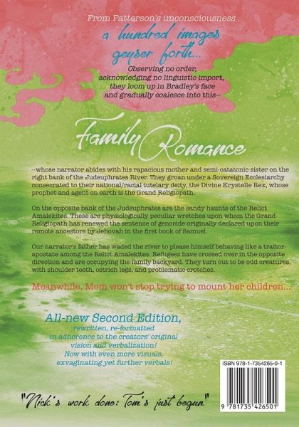From Patterson's unconsciousness a hundred images geyser forth. Observing no order, acknowledging no linguistic import, they loom up in Bradley's face and gradually coalesce into this-- Family Romance --whose narrator abides with his rapacious mother and semi-catatonic sister on the right bank of the Judeuphrates River. They groan under a Sovereign Ecclesiarchy consecrated to their national/racial tutelary deity, the Divine Krystelle Rex, whose prophet and agent on earth is the Grand Religiopath. On the opposite bank of the Judeuphrates are the sandy haunts of the Relict Amalekites. These are physiologically peculiar wretches upon whom the Grand Religiopath has renewed the sentence of genocide originally declared upon their remote ancestors by Jehovah in the first book of Samuel. Our narrator's father has waded the river to please himself behaving like a traitor-apostate among the Relict Amalekites. Refugees have crossed over in the opposite direction and are occupying the family backyard. They turn out to be odd creatures, with shoulder teeth, ostrich legs, and problematic crotches. Meanwhile, Mom won't stop trying to mount her children... All-new Second Edition, rewritten, re-formatted in adherence to the creators' original vision and verbalization! Now with even more visuals, exvaginating yet further verbals!