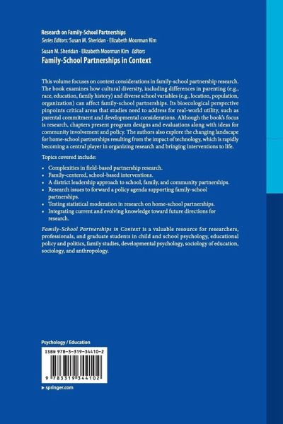 This volume focuses on context considerations in family-school partnership research. The book examines how cultural diversity, including differences in parenting (e.g., race, education, family history) and diverse school variables (e.g., location, population, organization,) can affect family-school partnerships. Its bio ecological perspective pinpoints critical areas that studies need to address for real-world utility, such as parental commitment and developmental considerations. Although the book's focus is research, chapters present program designs and evaluations along with ideas for community involvement and policy. The authors also explore the changing landscape for home-school partnerships resulting from the impact of technology, which is rapidly becoming a central player in organizing research and bringing interventions to life.