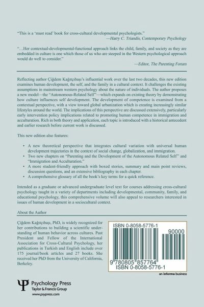Introduction to the Classic Edition 1. Introduction Part 1. Human Development, Self, and Family in Cultural Context 2. Development in Context 3. Socialization for Competence 4. Culture, Self, and Individualism-Collectivism 5. Value of Children and the Family 6. Parenting and the Development of the Autonomous-Related Self Part 2. Implications for Social Issues and Applications 7. Induced Change: The Role of Psychology 8. Intervention: Early Enrichment 9. The Turkish Early Enrichment Project (TEEP) 10. Immigration and Acculturation 11. Search for Integration and Policy Implications