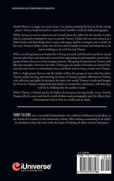 Family Shame is a tragic true story of an 11yr old boy looking for love in all the wrong places. Timmy finds himself in a dark lonely horrific world of child pornography. While trying to survive physical and mental abuse he suffers by his mother Linda, who is constantly looking for ways to punish Timmy. Linda who was also abused as a child drinks and does drugs and is crazy with anger, and her youngest son is clearly in her way. Timmy's father works out of town and is hardly at home and when he is, he wants nothing to do with his son Timmy. When not being beaten at home, he is being tortured and forced to perform sexual acts on other boys and men and coerced into appearing in pornographic movies for a group of men who serve as his surrogate parents. The group of men shower Timmy with affection and gifts. However, the older Timmy gets the harder it becomes to control him, and the men revert to intimidation fear and black mail to keep control over Timmy. Bill is a high-power lawyer and the leader within the group of men who has taken Timmy under his wing and winning the favor of Timmy's parents. Bill showers Timmy with affection and gifts; he becomes the male role model Timmy's needs and hunger for. Even so, Timmy is misguided and thinks sex means love, and money tells him how well he is, Making him the perfect victim. When Timmy is found out by his father, he becomes the big family secret. Family Shame tells of a scary and lonely world of abuse and pornography and the effects these environments had on him as a child and an adult.