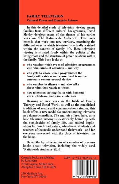 First Published in 2006. In this detailed study of television viewing among families from different cultural backgrounds, Morley develops many of the themes of his earlier work on the nationwide audience. This book extends that work into new territory, examining different ways in which television is actually watched within the context of family life. Here television viewing is situated firmly within the politics of the living room and the structure of power relations within the family.