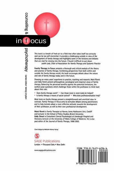 Drawing on many years' experience in practice, teaching and research, Mark Rivett and Eddy Street present philosophical, sociological and empirical views of family therapy. Balancing the perceived benefits against the potential limitations, they pose questions, which challenge those within the profession to think hard about their role.This book stimulates debate among practitioners and helps trainees adopt a more reflective and critical attitude towards their own professional development and the development of their profession.