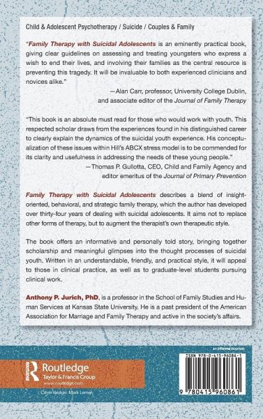 This book describes a blend of insight-oriented, behavioral, and strategic family therapy, which the author has developed over thirty-four years of dealing with suicidal adolescents. It aims not to replace other forms of therapy but to augment the therapist's own therapeutic style. The book offers an informative and personally told story bringing together scholarship and meaningful glimpses into the thought processes of suicidal youth. Written in an understandable, friendly, and practical style, it will appeal to those in clinical practice, as well as graduate-level students pursuing clinical work.