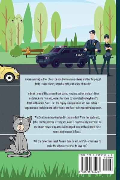 Award-winning author Cheryl Denise Bannerman delivers another helping of tasty Italian dishes (with the recipes!), adorable cats, and a side of murder. In book three of this cozy culinary series, mystery author and part-time meddler, Anna Romano, opens her home to her detective boyfriend's troubled brother, Scott. But the happy family reunion was over before it began when a body is found in her home, and Scott subsequently disappears. Was Scott somehow involved in the murder? While her boyfriend, John, and his partner investigate, Anna is mysteriously snatched. No one knows how or why Anna is kidnapped, except that it must have something to do with Scott. Will the detectives reach Anna in time or will John's brother have to make the ultimate sacrifice to save her?