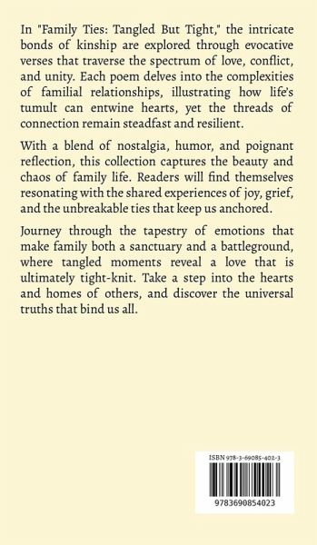 In "Family Ties: Tangled But Tight," the intricate bonds of kinship are explored through evocative verses that traverse the spectrum of love, conflict, and unity. Each poem delves into the complexities of familial relationships, illustrating how life's tumult can entwine hearts, yet the threads of connection remain steadfast and resilient. With a blend of nostalgia, humor, and poignant reflection, this collection captures the beauty and chaos of family life. Readers will find themselves resonating with the shared experiences of joy, grief, and the unbreakable ties that keep us anchored. Journey through the tapestry of emotions that make family both a sanctuary and a battleground, where tangled moments reveal a love that is ultimately tight-knit. Take a step into the hearts and homes of others, and discover the universal truths that bind us all.