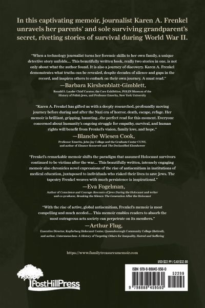 In this captivating memoir, journalist Karen A. Frenkel unravels her parents' and sole surviving grandparent's secret, riveting stories of survival during World War II. How do you shatter the silence that muffles family stories when those who knew what happened are gone? In Family Treasures Lost and Found, journalist and daughter of Holocaust survivors, Karen A. Frenkel, investigates her parents' unspoken WWII stories. Readers accompany Frenkel on her quest and discovery of how her resourceful parents survived on the run from the Nazis. Her research leads to shocking revelations of one parent's trans-Atlantic escape to Mexico and New York, and how the other eluded capture throughout Eastern and Central Europe with false papers. Having scoured online and real-world archives and visited the relevant cities, Frenkel honors her parents, her sole surviving grandparent, and her lost relatives, who cease to be mere names and who she came to respect and love. The tale Frenkel weaves is both personal and universal, as we begin to feel that her family could be ours. Frenkel also shares her refugee great-grandparents' rare and huge collection of stunning oil and pastel portraits, photos, and documents, which were discovered in 1968 in garbage bags. Most Holocaust families lost everything, but these cherished artifacts reveal the Jewish assimilated culture in Kraków and Berlin that the Nazis obliterated. Readers also join Frenkel on her visit to Vienna, Kraków, Tarnów, and Lviv, Ukraine, where the action took place. Such astonishing tales of survival, resistance, luck, and loss have the power to captivate readers of all generations and backgrounds and inspire them to explore their own family histories.