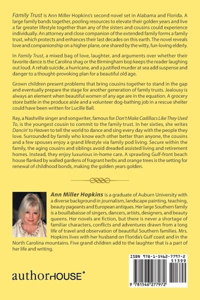 Family Trust is Ann Miller Hopkins's second novel set in Alabama and Florida. A large family bands together, pooling resources to elevate their golden years and live a far greater lifestyle together than any of the sisters and cousins could experience individually. An attorney and close companion of the extended family forms a family trust, which protects and enhances their last decades on this earth. The novel reveals love and companionship on a higher plane, one shared by the witty, fun-loving elderly. In Family Trust, a mixed bag of love, laughter, and arguments over whether their favorite dance is the Carolina shag or the Birmingham bop keeps the reader laughing out loud. A rehab suicide, a hurricane, and a justified murder at sea add suspense and danger to a thought-provoking plan for a beautiful old age. Grown children present problems that bring cousins together to stand in the gap and eventually prepare the stage for another generation of family trusts. Jealousy is always an element when beautiful women of any age are in the equation. A grocery store battle in the produce aisle and a volunteer dog-bathing job in a rescue shelter could have been written for Lucille Ball. Ray, a Nashville singer and songwriter, famous for Don't Make Cadillacs Like They Used To, is the youngest cousin to commit to the family trust. In her sixties, she writes Dancin' to Heaven to tell the world to dance and sing every day with the people they love. Surrounded by family who know each other better than anyone, the cousins and a few spouses enjoy a grand lifestyle via family pod living. Secure within the family, the aging cousins and siblings avoid dreaded assisted living and retirement homes. Instead, they enjoy luxurious in-home care. A sprawling Gulf-front beach house flanked by walled gardens of fragrant herbs and orange trees is the setting for renewal of childhood bonds, making the golden years golden.