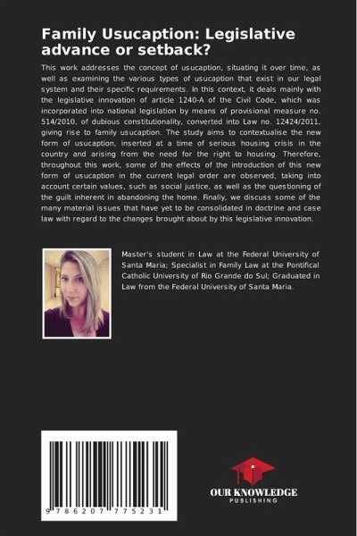 This work addresses the concept of usucaption, situating it over time, as well as examining the various types of usucaption that exist in our legal system and their specific requirements. In this context, it deals mainly with the legislative innovation of article 1240-A of the Civil Code, which was incorporated into national legislation by means of provisional measure no. 514/2010, of dubious constitutionality, converted into Law no. 12424/2011, giving rise to family usucaption. The study aims to contextualise the new form of usucaption, inserted at a time of serious housing crisis in the country and arising from the need for the right to housing. Therefore, throughout this work, some of the effects of the introduction of this new form of usucaption in the current legal order are observed, taking into account certain values, such as social justice, as well as the questioning of the guilt inherent in abandoning the home. Finally, we discuss some of the many material issues that have yet to be consolidated in doctrine and case law with regard to the changes brought about by this legislative innovation.