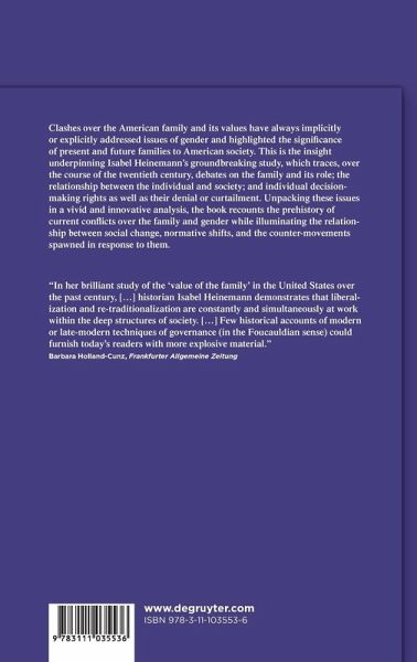 Clashes over the American family and its values have always implicitly or explicitly addressed issues of gender and highlighted the significance of present and future families to American society. This is the insight underpinning Isabel Heinemann's groundbreaking study, which traces, over the course of the twentieth century, debates on the family and its role; the relationship between the individual and society; and individual decision-making rights as well as their denial or curtailment. Unpacking these issues in a vivid and innovative analysis, the book recounts the prehistory of current conflicts over the family and gender while illuminating the relationship between social change, normative shifts, and the counter-movements spawned in response to them.