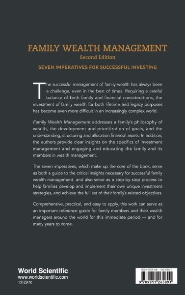 The successful management of family wealth has always been a challenge, even in the best of times. Requiring a careful balance of both family and financial considerations, the investment of family wealth for both lifetime and legacy purposes has become even more difficult in an increasingly complex world. Family Wealth Management addresses a family's philosophy of wealth, the development and prioritization of goals, and the understanding, structuring and allocation financial assets. In addition, the authors provide clear insights on the specifics of investment management and engaging and educating the family and its members in wealth management. The seven imperatives, which make up the core of the book, serve as both a guide to the critical insights necessary for successful family wealth management, and also serve as a step-by-step process to help families develop and implement their own unique investment strategies, and achieve the full set of their family's related objectives. Comprehensive, practical, and easy to apply, this work can serve as an important reference guide for family members and their wealth managers around the world for this immediate period - and for many years to come.