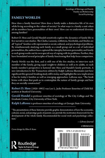 How does a family function? How does a family make a distinctive life of its own while living according to the values of society? In what ways is a family a unit when all its members have personalities of their own? How can we understand diversity among families? Robert D. Hess and Gerald Handel sensitively explore the dynamics of family life in five narrative case studies. The Clarks, Lansons, Littletons, Newbolds, and Steeles are all "typical" families with representative social, cultural, and psychological problems. By simultaneously studying each family as a small group and as a set of individual personalities, the authors have captured the interplay between personality and family as each group works out its own special way of coping with its problems. Further, they have formulated several principles of family functioning that help focus comparison. Family Worlds was the first, and is still one of the few studies, to interview each member of the family, giving equal weight to children as well as to adults, so each family member's perspective is factored into Hess and Handel's family portraits. A new introduction to the Transaction edition illuminates just how significant this ground-breaking study still is today and highlights the new implications it has for today's families as well as emerging approaches.