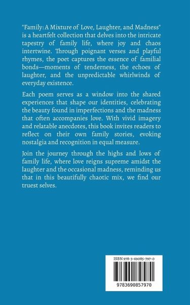 "Family: A Mixture of Love, Laughter, and Madness" is a heartfelt collection that delves into the intricate tapestry of family life, where joy and chaos intertwine. Through poignant verses and playful rhymes, the poet captures the essence of familial bonds-moments of tenderness, the echoes of laughter, and the unpredictable whirlwinds of everyday existence. Each poem serves as a window into the shared experiences that shape our identities, celebrating the beauty found in imperfections and the madness that often accompanies love. With vivid imagery and relatable anecdotes, this book invites readers to reflect on their own family stories, evoking nostalgia and recognition in equal measure. Join the journey through the highs and lows of family life, where love reigns supreme amidst the laughter and the occasional madness, reminding us that in this beautifully chaotic mix, we find our truest selves.