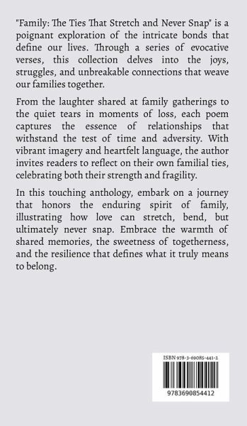 "Family: The Ties That Stretch and Never Snap" is a poignant exploration of the intricate bonds that define our lives. Through a series of evocative verses, this collection delves into the joys, struggles, and unbreakable connections that weave our families together. From the laughter shared at family gatherings to the quiet tears in moments of loss, each poem captures the essence of relationships that withstand the test of time and adversity. With vibrant imagery and heartfelt language, the author invites readers to reflect on their own familial ties, celebrating both their strength and fragility. In this touching anthology, embark on a journey that honors the enduring spirit of family, illustrating how love can stretch, bend, but ultimately never snap. Embrace the warmth of shared memories, the sweetness of togetherness, and the resilience that defines what it truly means to belong.