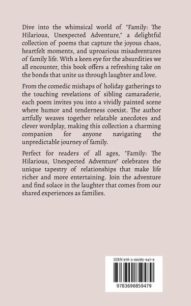 Dive into the whimsical world of "Family: The Hilarious, Unexpected Adventure," a delightful collection of poems that capture the joyous chaos, heartfelt moments, and uproarious misadventures of family life. With a keen eye for the absurdities we all encounter, this book offers a refreshing take on the bonds that unite us through laughter and love. From the comedic mishaps of holiday gatherings to the touching revelations of sibling camaraderie, each poem invites you into a vividly painted scene where humor and tenderness coexist. The author artfully weaves together relatable anecdotes and clever wordplay, making this collection a charming companion for anyone navigating the unpredictable journey of family. Perfect for readers of all ages, "Family: The Hilarious, Unexpected Adventure" celebrates the unique tapestry of relationships that make life richer and more entertaining. Join the adventure and find solace in the laughter that comes from our shared experiences as families.