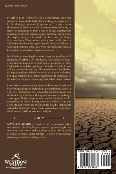 FAMINE DAY APPROACHES demonstrates how the author has successfully dealt with the obstacles, and needs in her life during many years of experiences. Travel with her as she learned to define the need of patience from defeatism, a lack of communication from a lack of faith, accepting wise discernment when she was emotionally disturbed, and knowing the inspiration given by God from her own conflicting interpretations. The author depicts how she learned to differentiate between the approaches which endorse Christian values and common-sense ethics from the approaches that can bring about a reproach of disgrace and shame. In addition to revealing the author's personal problems and triumphs, FAMINE DAY APPROACHES consists of sixty-plus fictional short stories, described as paintings. It, also, discloses the remarkable experience that initiated her depictions of human nature in writing. The narratives are descriptive, dialogical problems which are solved with good definitive, principled solutions. Her years of experiences add dynamisms to the variety of mindsets referencing potentials of human nature. Learn how to become keenly aware of the many charted, and honorable privileges available when a personal famine occurs in one's own life. Discover how famine day abundances can offset the famine day scarcities with surprised amazement. Although a shortage of Godly discernment is prevalent in today's world, it need not be. Besides having access to the Holy Scriptures a well-stocked warehouse of famine day bread is identifiable within this work which closely relates to an eminent masterpiece which ardently addresses the same subjects.