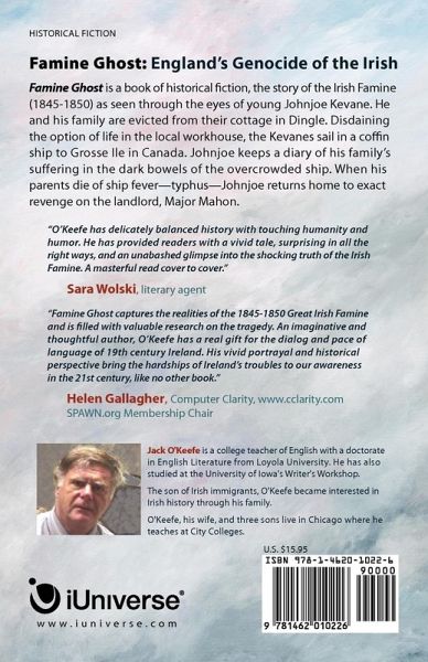 Famine Ghost: England's Genocide of the Irish,/i> Famine Ghost is a book of historical fiction, the story of the Irish Famine (1845-1850) as seen through the eyes of young Johnjoe Kevane. He and his family are evicted from their cottage in Dingle. Disdaining the option of life in the local workhouse, the Kevanes sail in a coffin ship to Grosse Ile in Canada. Johnjoe keeps a diary of his family's suffering in the dark bowels of the overcrowded ship. When his parents die of ship fever-typhus-Johnjoe returns home to exact revenge on the landlord, Major Mahon. "O'Keefe has delicately balanced history with touching humanity and humor. He has provided readers with a vivid tale, surprising in all the right ways, and an unabashed glimpse into the shocking truth of the Irish Famine. A masterful read cover to cover." --Sara Wolski, literary agent "Famine Ghost captures the realities of the 1845-1850 Great Irish Famine and is filled with valuable research on the tragedy. An imaginative and thoughtful author, O'Keefe has a real gift for the dialog and pace of language of 19th century Ireland. His vivid portrayal and historical perspective bring the hardships of Ireland's troubles to our awareness in the 21st century, like no other book." --Helen Gallagher, Computer Clarity, www.cclarity.com