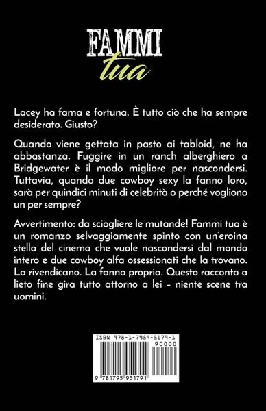 Lacey ha fama e fortuna. È tutto ciò che ha sempre desiderato. Giusto? Quando viene gettata in pasto ai tabloid, ne ha abbastanza. Fuggire in un ranch alberghiero a Bridgewater è il modo migliore per nascondersi. Tuttavia, quando due cowboy sexy la fanno loro, sarà per quindici minuti di celebrità o perché vogliono un per sempre? Avvertimento: da sciogliere le mutande! Fammi tua è un romanzo selvaggiamente spinto con un'eroina stella del cinema che vuole nascondersi dal mondo intero e due cowboy alfa ossessionati che la trovano. La rivendicano. La fanno propria. Questo racconto a lieto fine gira tutto attorno a lei - niente scene tra uomini.