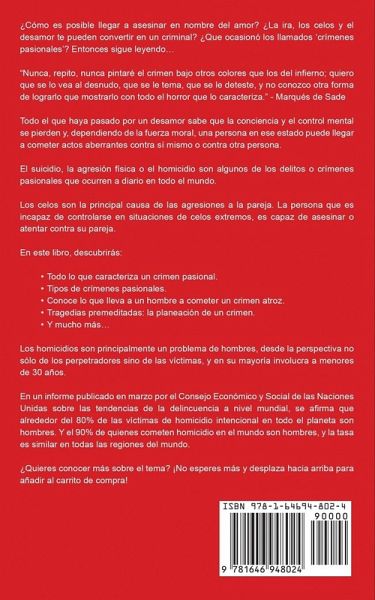 ¿Cómo es posible llegar a asesinar en nombre del amor? ¿La ira, los celos y el desamor te pueden convertir en un criminal? ¿Que ocasionó los llamados 'crímenes pasionales'? Entonces sigue leyendo... "Nunca, repito, nunca pintaré el crimen bajo otros colores que los del infierno; quiero que se lo vea al desnudo, que se le tema, que se le deteste, y no conozco otra forma de lograrlo que mostrarlo con todo el horror que lo caracteriza." - Marqués de Sade Todo el que haya pasado por un desamor sabe que la conciencia y el control mental se pierden y, dependiendo de la fuerza moral, una persona en ese estado puede llegar a cometer actos aberrantes contra sí mismo o contra otra persona. El suicidio, la agresión física o el homicidio son algunos de los delitos o crímenes pasionales que ocurren a diario en todo el mundo. Los celos son la principal causa de las agresiones a la pareja. La persona que es incapaz de controlarse en situaciones de celos extremos, es capaz de asesinar o atentar contra su pareja. En este libro, descubrirás: Todo lo que caracteriza un crimen pasional. Tipos de crímenes pasionales. Conoce lo que lleva a un hombre a cometer un crimen atroz. Tragedias premeditadas: la planeación de un crimen. Y mucho más... Los homicidios son principalmente un problema de hombres, desde la perspectiva no sólo de los perpetradores sino de las víctimas, y en su mayoría involucra a menores de 30 años. En un informe publicado en marzo por el Consejo Económico y Social de las Naciones Unidas sobre las tendencias de la delincuencia a nivel mundial, se afirma que alrededor del 80% de las víctimas de homicidio intencional en todo el planeta son hombres. Y el 90% de quienes cometen homicidio en el mundo son hombres, y la tasa es similar en todas las regiones del mundo. ¿Quieres conocer más sobre el tema? ¡No esperes más y desplaza hacia arriba para añadir al carrito de compra!