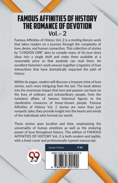 "Famous Affinities of History Vol. 2" is a riveting literary work that takes readers on a journey through the complexity of love, desire, and human connection. This collection of stories by "LYNDON ORR" aims to compile many of his love story ideas into a single draft and make them available at a reasonable price so that anybody can read them. An excellent historian's work weaves together a tapestry of love interactions that have dramatically impacted the path of history. Within its pages, readers will discover a treasure mine of love stories, each more intriguing than the last. The book delves into the enormous impact that love and passion can have on the lives of ordinary and extraordinary people, from the turbulent affairs of famous historical figures to the clandestine romances of lesser-known people. "Famous Affinities of History Vol. 2" stories are more than just romantic tales; they provide insight into the hearts and minds of the individuals who formed our world. These stories span location and time, emphasizing the universality of human emotions as well as the enduring power of love throughout history. This edition of "FAMOUS AFFINITIES OF HISTORY Vol.-2" is both modern and legible, with a fresh cover and professionally typeset manuscript.