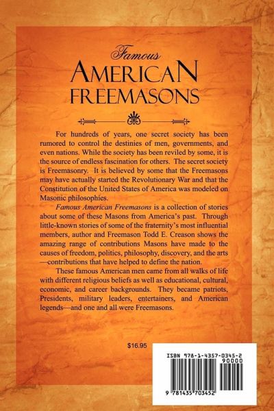 Famous American Freemasons is a collection of stories about some of the Masons from America's past. Through little-known stories of some of the fraternity's most influential members, Todd E. Creason shows the amazing range of contributions Masons have made to the causes of freedom, politics, philosophy, scientific discovery, and the arts-contributions that have helped to define the nation. In Famous American Freemasons, author and Freemason Todd E. Creason also gives unique insight into the history and philosophy of Freemasonry in America while debunking common myths and misconceptions about the world's largest and oldest fraternal organization. These famous American men came from all walks of life with different religious beliefs as well as educational, cultural, economic, and career backgrounds. They became patriots, Presidents, military leaders, entertainers, and American legends-and one and all were Freemasons.