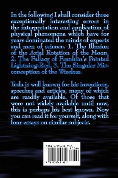 In the following I shall consider three exceptionally interesting errors in the interpretation and application of physical phenomena which have for years dominated the minds of experts and men of science. 1. The Illusion of the Axial Rotation of the Moon. 2. The Fallacy of Franklin's Pointed Lightning-Rod. 3. The Singular Misconception of the Wireless.Tesla is well known for his inventions, speeches and articles, many of which are readily available. Of those that were not widely available until now, this is perhaps his best known. Now you can read it for yourself, along with four essays on similar subjects.