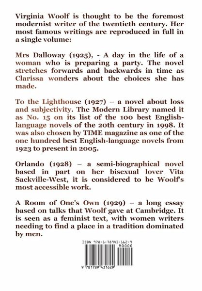Virginia Woolf is thought to be the foremost modernist writer of the twentieth century. Her most famous writings are reproduced in full in a single volume: Mrs Dalloway (1925), - A day in the life of a woman who is preparing a party. The novel stretches forwards and backwards in time as Clarissa wonders about the choices she has made. To the Lighthouse (1927) - a novel about loss and subjectivity. The Modern Library named it as No. 15 on its list of the 100 best English-language novels of the