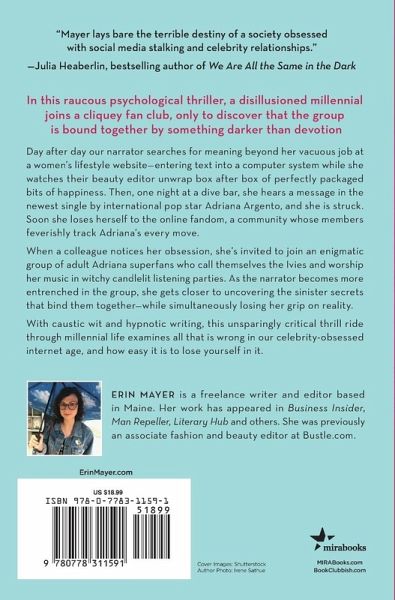 "Mayer lays bare the terrible destiny of a society obsessed with social media stalking and celebrity relationships." -Julia Heaberlin, bestselling author of We Are All the Same in the Dark In this raucous psychological thriller, a disillusioned millennial joins a cliquey fan club, only to discover that the group is bound together by something darker than devotion Day after day our narrator searches for meaning beyond her vacuous job at a women's lifestyle website-entering text into a computer system while she watches their beauty editor unwrap box after box of perfectly packaged bits of happiness. Then, one night at a dive bar, she hears a message in the newest single by international pop star Adriana Argento, and she is struck. Soon she loses herself to the online fandom, a community whose members feverishly track Adriana's every move. When a colleague notices her obsession, she's invited to join an enigmatic group of adult Adriana superfans who call themselves the Ivies and worship her music in witchy candlelit listening parties. As the narrator becomes more entrenched in the group, she gets closer to uncovering the sinister secrets that bind them together-while simultaneously losing her grip on reality. With caustic wit and hypnotic writing, this unsparingly critical thrill ride through millennial life examines all that is wrong in our celebrity-obsessed internet age, and how easy it is to lose yourself in it.