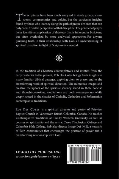 The Scriptures have been much analyzed in study groups, class-rooms, commentaries and pulpits. But the particular insights found by those who journey along the path of prayer are ones that can only come from the perspective of that discipline. The practice of prayer helps identify an application of theology that is inherent in Scripture, but often overlooked by more analytical approaches. For anyone pursuing truth in their relationship with God, an understanding of spiritual direction in light of Scripture is essential. In the tradition of Christian contemplatives and mystics from the early centuries to the present, Rob Des Cotes brings fresh insights to many familiar biblical passages, applying them to prayer and to the transforming work of spiritual direction. The numerous images and creative metaphors of the spiritual journey found in these concise and thought-provoking meditations are both contemporary while deeply rooted in the classics of Catholic, Orthodox and Reformation contemplative traditions. Rob Des Cotes is a spiritual director, retreat leader and pastor of Imago Dei (www.imagodeicommunity.ca), a network of faith communities that encourages the practice of prayer and a transforming relationship with God. He has taught spiritual theology at Trinity Western University, Columbia Bible College and at Carey Theological College and is also associated, as a spiritual director, with a number of churches and Christian institutions.