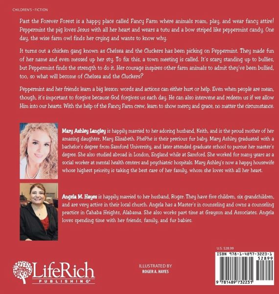 Past the Forever Forest is a happy place called Fancy Farm where animals roam, play, and wear fancy attire! Peppermint the pig loves Jesus with all her heart and wears a tutu and a bow striped like peppermint candy. One day, the wise farm owl finds her crying and wants to know why. It turns out a chicken gang known as Chelsea and the Cluckers has been picking on Peppermint. They made fun of her name and even messed up her sty. To fix this, a town meeting is called. It's scary standing up to bullies, but Peppermint finds the strength to do it. Her courage inspires other farm animals to admit they've been bullied, too, so what will become of Chelsea and the Cluckers? Peppermint and her friends learn a big lesson: words and actions can either hurt or help. Even when people are mean, though, it's important to forgive because God forgives us each day. He can also intervene and redeem us if we allow Him into our hearts. With the help of the Fancy Farm crew, learn to show mercy and grace, no matter the circumstance.