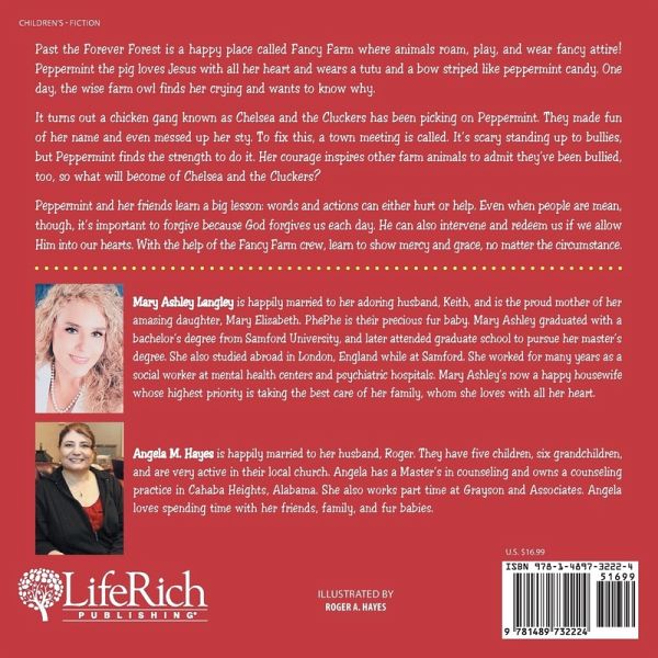 Past the Forever Forest is a happy place called Fancy Farm where animals roam, play, and wear fancy attire! Peppermint the pig loves Jesus with all her heart and wears a tutu and a bow striped like peppermint candy. One day, the wise farm owl finds her crying and wants to know why. It turns out a chicken gang known as Chelsea and the Cluckers has been picking on Peppermint. They made fun of her name and even messed up her sty. To fix this, a town meeting is called. It's scary standing up to bullies, but Peppermint finds the strength to do it. Her courage inspires other farm animals to admit they've been bullied, too, so what will become of Chelsea and the Cluckers? Peppermint and her friends learn a big lesson: words and actions can either hurt or help. Even when people are mean, though, it's important to forgive because God forgives us each day. He can also intervene and redeem us if we allow Him into our hearts. With the help of the Fancy Farm crew, learn to show mercy and grace, no matter the circumstance.