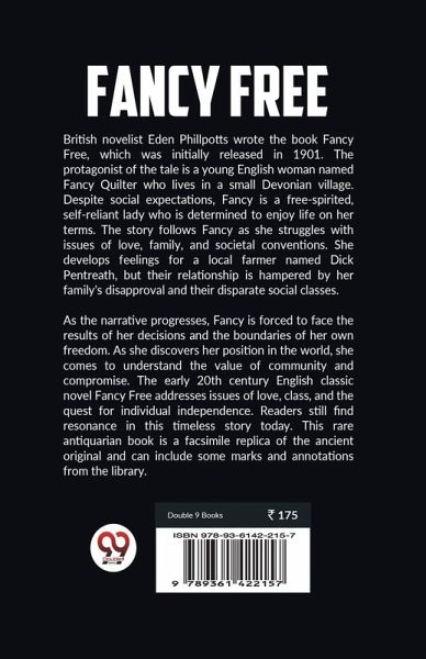 British novelist Eden Phillpotts wrote the book Fancy Free, which was initially released in 1901. The protagonist of the tale is a young English woman named Fancy Quilter who lives in a small Devonian village. Despite social expectations, Fancy is a free-spirited, self-reliant lady who is determined to enjoy life on her terms. The story follows Fancy as she struggles with issues of love, family, and societal conventions. She develops feelings for a local farmer named Dick Pentreath, but their relationship is hampered by her family's disapproval and their disparate social classes. As the narrative progresses, Fancy is forced to face the results of her decisions and the boundaries of her own freedom. As she discovers her position in the world, she comes to understand the value of community and compromise. The early 20th century English classic novel Fancy Free addresses issues of love, class, and the quest for individual independence. Readers still find resonance in this timeless story today. This rare antiquarian book is a facsimile replica of the ancient original and can include some marks and annotations from the library.