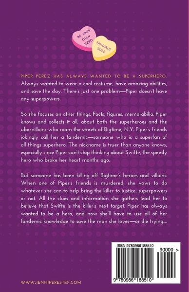 Piper Perez has always wanted to be a superhero. Always wanted to wear a cool costume, have amazing abilities, and save the day. There's just one problem-Piper doesn't have any superpowers. So she focuses on other things. Facts, figures, memorabilia. Piper knows and collects it all, about both the superheroes and the ubervillains who roam the streets of Bigtime, N.Y. Piper's friends jokingly call her a fandemic-someone who is a superfan of all things superhero. The nickname is truer than anyone knows, especially since Piper can't stop thinking about Swifte, the speedy hero who broke her heart months ago. But someone has been killing off Bigtime's heroes and villains. When one of Piper's friends is murdered, she vows to do whatever she can to help bring the killer to justice, superpowers or not. All the clues and information she gathers lead her to believe that Swifte is the killer's next target. Piper has always wanted to be a hero, and now she'll have to use all of her fandemic knowledge to save the man she loves-or die trying.... Note: Fandemic is around 43,000 words. It is Book 5 in the Bigtime superhero series.