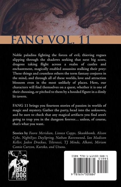 Noble paladins fighting the forces of evil, thieving rogues slipping through the shadows seeking that next big score, dragons taking flight across a realm of castles and enchantment, magically enabled assassins stalking their prey: These things and countless others the term fantasy conjures in the mind, and through all of these worlds, love and attraction blossom even in the most unlikely of places. Here, our characters will find themselves on a quest, whether it is one of their choosing, or pitched to them by a hooded figure in a dimly lit tavern. FANG 11 brings you fourteen stories of passion in worlds of magic and mystery. Gather the party, head into the unknown, and be sure to check that any magical artifacts you find aren't going to trap you in the dungeon forever... unless, of course, that's what you want. Cover illustration by Rukis Stories by Faora Meridian, Linnea Capps, Skunkbomb, Alison Cybe, NightEyes DaySpring, Nathan Ravenwood, Ian Madison Keller, Jaden Drackus, Televassi, TJ Minde, Alkani, Miriam Camio Curzon, Kuroko, and Utunu.