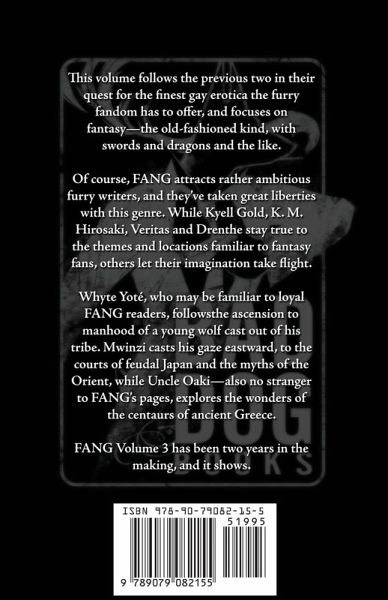This is the third anthology of gay erotica in the Fang line from Bad Dog Books and features a fantasy theme. Features the following stories: Sanguine and Clockwork by K. M. Hirosaki Magic and Mischief by Kyell Gold Dragon's Love by Karai Crocuta Coming of Age by Whyte Yoté Black & White by Veritas Love of the Colossi by Graveyard Greg Fall by Mwinzi The Glade by Uncle Oakie Daydream Gone Wrong by Stephan von Krieger Dedication of the Tower by Drenthe