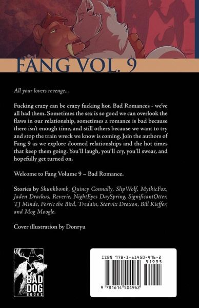 All your lovers revenge… Fucking crazy can be crazy fucking hot. Bad Romances - we’ve all had them. Sometimes the sex is so good we can overlook the flaws in our relationship, sometimes a romance is bad because there isn’t enough time, and still others because we want to try and stop the train wreck we know is coming. Join the authors of Fang 9 as we explore doomed relationships and the hot times that keep them going. You’ll laugh, you’ll cry, you’ll swear, and hopefully get turned on.Welcome to Fang Volume 9 – Bad Romance. Stories by Skunkbomb, Quincy Connally, SlipWolf, MythicFox, Jaden Drackus, Reverie, NightEyes DaySpring, SignificantOtter, TJ Minde, Ferric the Bird, Tredain, Starvix Draxon, Bill Kieffer, and Mog Moogle.