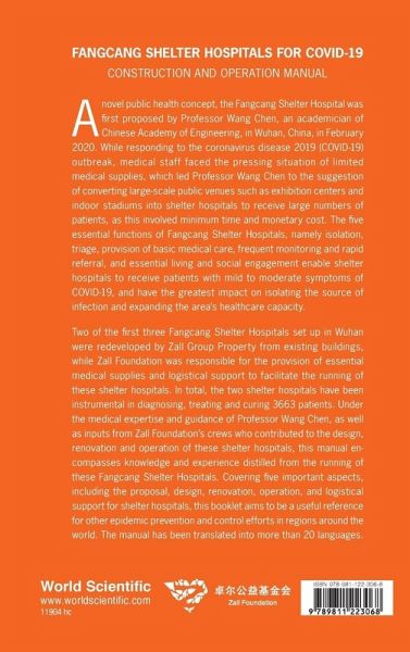 A novel public health concept, the Fangcang Shelter Hospital was first proposed by Professor Wang Chen, an academician of Chinese Academy of Engineering, in Wuhan, China, in February 2020. While responding to the coronavirus disease 2019 (COVID-19) outbreak, medical staff faced the pressing situation of limited medical supplies, which led Professor Wang Chen to the suggestion of converting large-scale public venues such as exhibition centers and indoor stadiums into shelter hospitals to receive large number of patients, as this involved minimum time and monetary costs. The five essential functions of Fangcang Shelter Hospitals (isolation, triage, provision of basic medical care, frequent monitoring and rapid referral, and essential living and social engagement) enable shelter hospitals to receive patients with mild to moderate symptoms of COVID-19, and have the greatest impact on isolating the source of infection and expanding the area's health-care capacity. Two of the first three Fangcang Shelter Hospitals set up in Wuhan were redeveloped by Zall Group Property from existing buildings, while Zall Foundation was responsible for the provision of essential medical supplies and logistical support to facilitate the running of these shelter hospitals. In total, the two shelter hospitals have been instrumental in diagnosing, treating and curing 3663 patients. Under the medical expertise and guidance of Professor Wang Chen, as well as inputs from Zall Foundation's crews who contributed to the design, renovation and operation of these shelter hospitals, this manual encompasses knowledge and experience distilled from the running of these Fangcang Shelter Hospitals. Covering five important aspects, namely the proposal, design, renovation, operation, and logistical support for shelter hospitals, this booklet aims to be a useful reference for other epidemic prevention and control efforts in regions around the world. The manual has been translated into more than 20 languages.