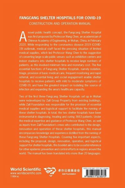A novel public health concept, the Fangcang Shelter Hospital was first proposed by Professor Wang Chen, an academician of Chinese Academy of Engineering, in Wuhan, China, in February 2020. While responding to the coronavirus disease 2019 (COVID-19) outbreak, medical staff faced the pressing situation of limited medical supplies, which led Professor Wang Chen to the suggestion of converting large-scale public venues such as exhibition centers and indoor stadiums into shelter hospitals to receive large number of patients, as this involved minimum time and monetary costs. The five essential functions of Fangcang Shelter Hospitals (isolation, triage, provision of basic medical care, frequent monitoring and rapid referral, and essential living and social engagement) enable shelter hospitals to receive patients with mild to moderate symptoms of COVID-19, and have the greatest impact on isolating the source of infection and expanding the area's health-care capacity. Two of the first three Fangcang Shelter Hospitals set up in Wuhan were redeveloped by Zall Group Property from existing buildings, while Zall Foundation was responsible for the provision of essential medical supplies and logistical support to facilitate the running of these shelter hospitals. In total, the two shelter hospitals have been instrumental in diagnosing, treating and curing 3663 patients. Under the medical expertise and guidance of Professor Wang Chen, as well as inputs from Zall Foundation's crews who contributed to the design, renovation and operation of these shelter hospitals, this manual encompasses knowledge and experience distilled from the running of these Fangcang Shelter Hospitals. Covering five important aspects, namely the proposal, design, renovation, operation, and logistical support for shelter hospitals, this booklet aims to be a useful reference for other epidemic prevention and control efforts in regions around the world. The manual has been translated into more than 20 languages.