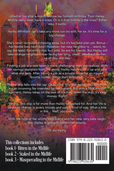 Jilted at the altar a month before her fortieth birthday. Poor Hailey. Midlife really does have a crisis. Or is it that midlife is the crisis? Either way, it sucks. Hailey Whitfield can't take any more run-ins with her ex. It's time for a big change. She's never considered moving away, but it's her best plan yet. Bonus – her bestie lives next door! However, her new neighbor is… weird, to say the least. Extremely hot, but odd. So are his friends. But Hailey will take strange neighbors over facing her lying, cheat, deadbeat ex-fiancé all day, any day. Finding a job in a new town is more challenging than she realizes. With her savings depleted from the move, Hailey has to suck it up and take what she gets. After taking a job as a private nurse for an injured bounty hunter, things start to look up. Then a skip falls into her lap. Okay, sure. She was being nosy and reading an incoming fax intended for her patient. But with a little encouragement, Hailey takes on the task of tracking down the skip. It's easy money. Right? Wrong. This skip is far more than Hailey bargained for. And her life is about to change in a very bloody and pointy kind of way. What a bite in the… Well, you know. With the help of her witchy best friend and her new, very pale neighbor, Hailey is going to collect her bounty. Or die trying. This collection includes: Bitten in the Midlife Staked in the Midlife Masquerading in the Midlife