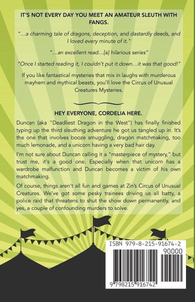 IT'S NOT EVERY DAY YOU MEET AN AMATEUR SLEUTH WITH FANGS. * "...a charming tale of dragons, deception, and dastardly deeds, and I loved every minute of it." * "...an excellent read...[a] hilarious series" * "Once I started reading it, I couldn't put it down...it was that good!" * "Light and fanciful with a darn good mystery woven in. What fun!" If you like fantastical mysteries that mix in laughs with murderous mayhem and mythical beasts, you'll love the Circus of Unusual Creatures Mysteries. HEY EVERYONE, CORDELIA HERE. Duncan (aka "Deadliest Dragon in the West") has finally finished typing…mehr