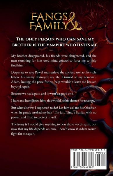 The only person who can save my brother is the vampire who hates me. My brother disappeared, his friends were slaughtered, and the man searching for him used mind control to force me to help find him. Desperate to save Pawel and retrieve the ancient artefact he stole before his enemy destroyed my life, I turned to my nemesis - Adam, hoping the price for his help wouldn't leave me broken beyond repair. Because we had a past, and it wasn't a good one. I hurt and humiliated him; this would be his chance for revenge. But what else was I supposed to do? Let him call me his Obsidian when he gently stroked my hair? I'm just Nina, a human with no power, and I had to protect myself. The irony is I would give anything to hear those words again, but now that my life depends on him, I don't know if Adam would fight for me again. _________________________________________________________ If you would like the urban settings of Kate Daniels and the spice of the Anita Blake series but with the Witcher's mythology - that is the book for you. _________________________________________________________ Fangs and Family is a fast-paced, action-packed, modern urban fantasy with a spicy, dark romance between a morally grey vampire and a human nurse. It can be read as a standalone or as a part of an Amber Legend series that explores the rich world of Slavic mythology and the legends of Pomerania. It features mature themes, including graphic on-page violence and mind control, explicit language, and on-page intimacy, making it suitable for a mature 18+ audience.