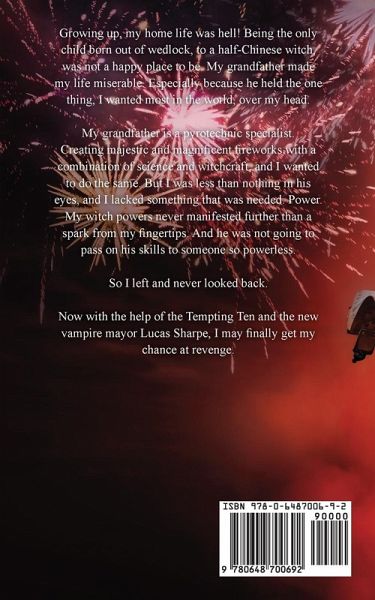 Growing up, my home life was hell! Being the only child born out of wedlock, to a half Chinese witch, was not a happy place to be. My grandfather made my life miserable. Especially because he held the one thing, I wanted most in the world, over my head. My grandfather is a pyrotechnic specialist. Creating majestic and magnificent fireworks with a combination of science and witchcraft, and I wanted to do the same. But I was less than nothing in his eyes, and I lacked something that was needed. Power. My witch powers never manifested further than a spark from my fingertips. And he was not going to pass on his skills to someone so powerless. So I left and never looked back. Now with the help of the Tempting Ten and the new vampire mayor Lucas Sharpe, I may finally get my chance at revenge.