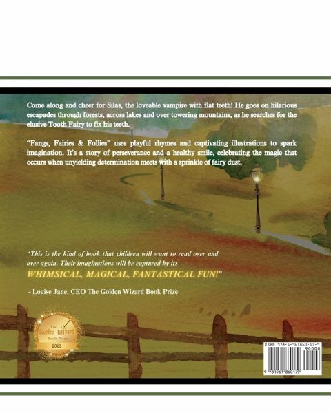 Come along and cheer for Silas, the loveable vampire with flat teeth! He goes on hilarious escapades through forests, across lakes and over towering mountains, as he searches for the elusive Tooth Fairy to fix his flat teeth. "Fangs, Fairies & Follies" uses playful rhymes and captivating illustrations to spark imagination. It's a story of perseverance and a healthy smile, celebrating the magic that occurs when unyielding determination meets with a sprinkle of fairy dust.