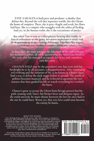 I am vengeance.Tate Aaralyn, a lone vampire vigilante who strikes fear into the hearts of monsters. My fangs puncture, and the flavor of iron-infused retribution drips down my throat when I exact justice. Don't be like them. Don't succumb to bloodlust. Make the b*stards pay. These rules have been my guide, leading me through life in the Glenn. And all had been flowing nicely until I met him...The male cloaked in secrets, wrapped in darkness, and holding the keys to my past and future: Aether. Complex. Messy. Unexpected. My whole world slipped into a tailspin of lies, betrayal, and secrets. As…mehr