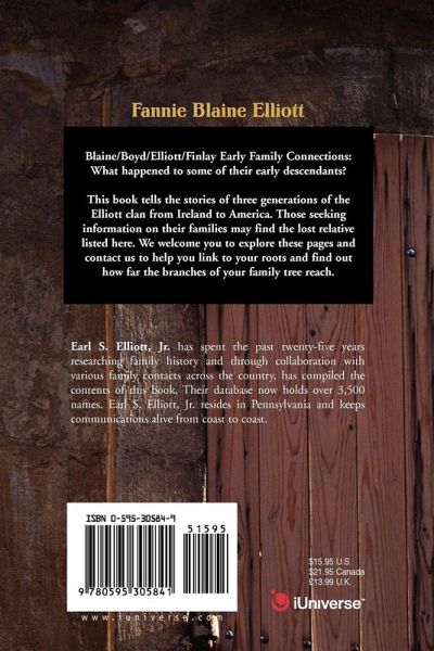 Blaine/Boyd/Elliott/Finlay Early Family Connections: What happened to some of their early descendants? This book tells the stories of three generations of the Elliott clan from Ireland to America. Those seeking information on their families may find the lost relative listed here. We welcome you to explore these pages and contact us to help you link to your roots and find out how far the branches of your family tree reach.