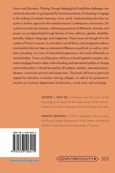 Fanon and Education: Thinking Through Pedagogical Possibilities challenges conventional education to go beyond the formal procedures of schooling to engage in the making of multiple meanings of our world. Understanding education requires a holistic approach that extends beyond contemporary classrooms. Education must also be inclusive, addressing questions of difference, diversity, and power, as conceptualized through the lens of class, ethnicity, gender, disability, sexuality, religion, language, and indigeneity. These issues are thought of in the context of Fanon's oeuvre, to articulate a social theory and progressive educational politics that can help us understand difference as political, as well as, dominant schooling, as a form of internalized oppression, that works differently on myriad bodies. Fanon and Education will have a broad appeal to readers who want to engage Fanon's ideas in the schooling and educational politics of change and transformation. It should be read by all students, teachers, educational practitioners, community activists and researchers. This book will have a particular appeal for educators in teacher training colleges, as well as for graduate instruction in university departments of education, social work, and sociology.