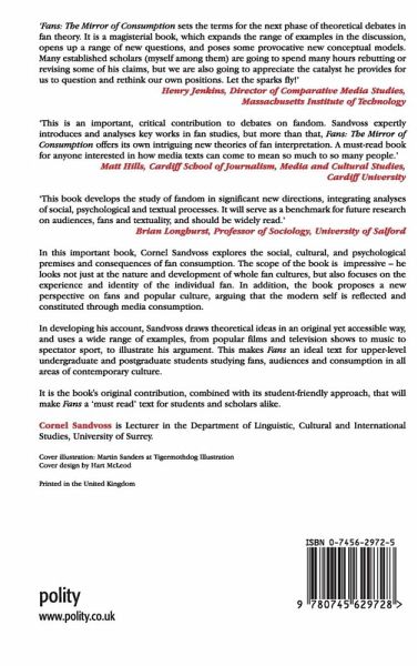 In "Fans: The Mirror of Consumption" Cornel Sandvoss explores the social, cultural, and psychological premises and consequences of fan consumption. The scope of the book is impressive - he looks not just at the nature and development of whole fan cultures, but also focuses on the experience and identity of the individual fan. In addition, the book proposes a new perspective on fans and popular culture, arguing that the modern self is reflected and constituted through media consumption. In developing his account, Sandvoss draws on theoretical ideas in an original yet accessible way, and uses a wide range of examples, from Star Trek to Madonna to football, to illustrate his argument. This makes 'Fans: the mirror of consumption' an ideal text for upper-level undergraduate and postgraduate students studying fans, audiences and consumption in all areas of contemporary culture. It is the book's original contribution, combined with its student-friendly approach, that will make 'Fans: The Mirror of Consumption' a 'must read' text for students and scholars alike.