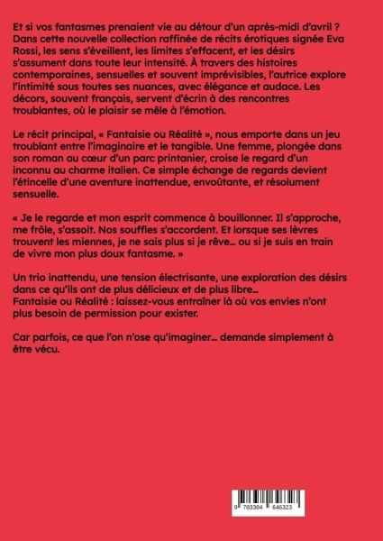 Et si vos fantasmes prenaient vie au détour d'un après-midi d'avril ?Dans cette nouvelle collection raffinée de récits érotiques signée Eva Rossi, les sens s'éveillent, les limites s'effacent, et les désirs s'assument dans toute leur intensité. À travers des histoires contemporaines, sensuelles et souvent imprévisibles, l'autrice explore l'intimité sous toutes ses nuances, avec élégance et audace. Les décors, souvent français, servent d'écrin à des rencontres troublantes, où le plaisir se mêle à l'émotion.Le récit principal, « Fantaisie ou Réalité », nous emporte dans un jeu troublant entre l'imaginaire et le tangible. Une femme, plongée dans son roman au coeur d'un parc printanier, croise le regard d'un inconnu au charme italien. Ce simple échange de regards devient l'étincelle d'une aventure inattendue, envoûtante, et résolument sensuelle.« Je le regarde et mon esprit commence à bouillonner. Il s'approche, me frôle, s'assoit. Nos souffles s'accordent. Et lorsque ses lèvres trouvent les miennes, je ne sais plus si je rêve... ou si je suis en train de vivre mon plus doux fantasme. »Un trio inattendu, une tension électrisante, une exploration des désirs dans ce qu'ils ont de plus délicieux et de plus libre...Fantaisie ou Réalité : laissez-vous entraîner là où vos envies n'ont plus besoin de permission pour exister.Car parfois, ce que l'on n'ose qu'imaginer... demande simplement à être vécu.